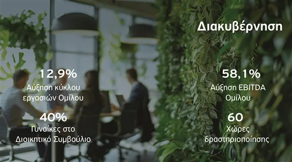 Η μείωση εκπομπών αερίων του θερμοκηπίου της μητρικής εταιρείας, Scope 1 και 2, έφθασε το 10% σε σχέση με το 2023, ενώ η ένταση εκπομπών μειώθηκε κατά 15,3%. Ο Όμιλος δεσμεύεται να μειώσει τις εκπομπές της μητρικής εταιρείας κατά 55% έως το 2030 (με έτος βάσης το 2022) και να επιτύχει μηδενικές εκπομπές μέχρι το 2050. Παράλληλα, η μητρική εταιρεία επαναχρησιμοποίησε το 59% του συνολικού όγκου νερού που διαχειρίστηκε, ο οποίος ανήλθε σε 562.845 m³, ενώ επεξεργάστηκε πλήρως το 100% των αποβλήτων που παρήγαγε.