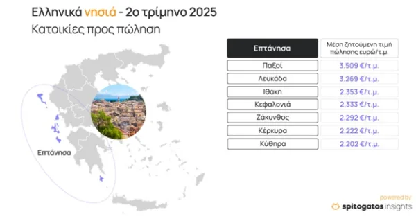 Τα Επτάνησα αποτελούν διαχρονικά έναν ιδιαίτερα δημοφιλή καλοκαιρινό προορισμό, τόσο για Έλληνες όσο και για επισκέπτες από το εξωτερικό, με συνεχώς αυξανόμενη τουριστική δραστηριότητα. Η δυναμική αυτή επηρεάζει άμεσα το ενδιαφέρον δυνητικών αγοραστών, τόσο από την Ελλάδα όσο και από το εξωτερικό. Κατά το 2ο τρίμηνο του 2025, η Κέρκυρα αναδεικνύεται ως το νησί με τη μεγαλύτερη ζήτηση για αγορά κατοικίας, ενώ οι Παξοί καταγράφουν τις υψηλότερες μέσες ζητούμενες τιμές πώλησης κατοικιών. Στον αντίποδα, πιο οικονομικά προσιτές επιλογές εντοπίζονται στην Κέρκυρα και στα Κύθηρα. Η μεγαλύτερη ετήσια αύξηση στις ΜΖΤ, άνω του 20%, καταγράφεται στη Λευκάδα, σε σύγκριση με το αντίστοιχο τρίμηνο του 2024.