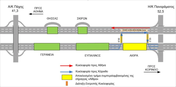 Στο διάστημα αυτό η κυκλοφορία προς Κόρινθο θα εξυπηρετείται από την αριστερή λωρίδα του αντίθετου ρεύματος, η κυκλοφορία προς Αθήνα θα περιοριστεί στη δεξιά λωρίδα, ενώ η μεσαία λωρίδα θα μείνει αποκλεισμένη ως ζώνη ασφάλειας μεταξύ των δύο αντίθετων κατευθύνσεων, όπως φαίνεται στο ακόλουθο σχηματικό διάγραμμα.