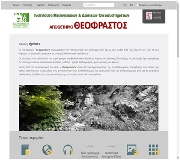 Μία από τις καινοτόμες υπηρεσίες της, είναι το Αποθετήριο Θεόφραστος. Ο Θεόφραστος αποτελεί το πρώτο ελληνικό αποθετήριο που αναφέρεται στις περιβαλλοντικές επιστήμες και το μοναδικό στον τομέα της δασολογίας. Πρόκειται για ένα ψηφιακό τόπο που αποτυπώνει όλη την επιστημονική δραστηριότητα του ΙΜΔΟ, από την ίδρυσή του έως σήμερα, σε ψηφιακή μορφή και με ανοιχτή διαδικτυακή πρόσβαση. Η ενσωμάτωση του υλικού γίνεται σταδιακά.