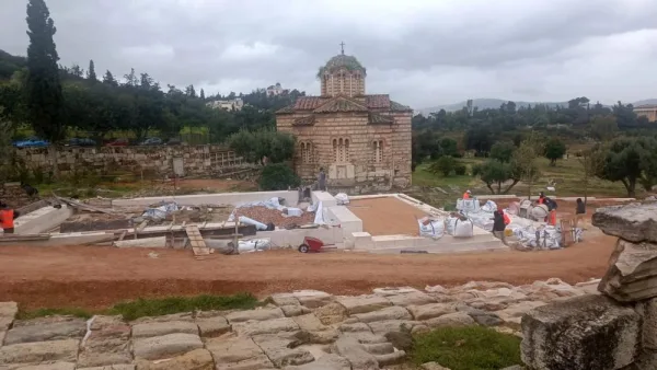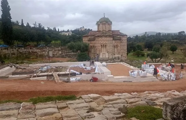 ΑΡΧΑΙΑ ΑΓΟΡΑ: Νέα κτήρια ανεγείρονται εδώ και ένα χρόνο στα βόρεια του αρχαιολογικού χώρου, για να στεγάσουν λειτουργίες έκδοσης και ελέγχου εισιτηρίων. Αντί συστηματικής ανασκαφής, χρησιμοποιήθηκαν βαρέα ερπυστριοφόρα μηχανήματα. Η εμφανής κατακόρυφη επιφάνεια της επίχωσης καλύφθηκε με ψηλό τοίχο αντιστήριξης από οπλισμένο σκυρόδεμα, με νοτιοδυτικό προσανατολισμό. Νέο δάπεδο από σκυρόδεμα στρώθηκε πάνω από την Παναθηναϊκή Οδό, που διασχίζει την Αγορά από βορειοδυτικά προς νοτιοανατολικά.