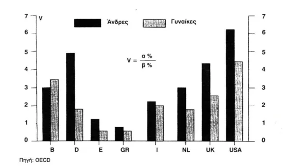 ♦ Στο διάγραμμα από τη δεκαετία του 1990 το ποσοστό ανεργίας ατόμων χαμηλής εκπαίδευσης ήταν 6 φορές μεγαλύτερο από το ποσοστό ανεργίας ατόμων με υψηλή εκπαίδευση στις ΗΠΑ . Το εργασιακό περιβάλλον της χώρας αυτής απαιτούσε εκπαίδευση επιπέδου για να εισχωρήσει κανείς σε αυτό. Ανάλογα στις Βόρειες χώρες της Ευρωπαϊκής Ένωσης , το ποσοστό ανεργίας ατόμων χαμηλής εκπαίδευσης ήταν 4 φορές μεγαλύτερο στο Ηνωμένο Βασίλειο , 4,8 φορές στη Δανία, 3,2 φορές στην Ολλανδία. Στις Νότιες χώρες της ΕΕ ήταν μόνο 1,8 φορές στην Ιταλία , 1,3 στην Ισπανία, και 0,8 φορές στην Ελλάδα . Οι εκπαιδευμένοι είχαν μεγαλύτερες δυσκολίες να εισέλθουν παραγωγικά στην αγορά εργασίας συγκριτικά με τους ανεκπαίδευτους που ισχύει και σήμερα , και οι εκπαιδευμένοι νέοι καταφεύγουν στις αγορές του εξωτερικού, ενώ το χαμηλού επιπέδου εργασιακό περιβάλλον παράγει χαμηλό εισόδημα και δυνατότητες διαβίωσης .