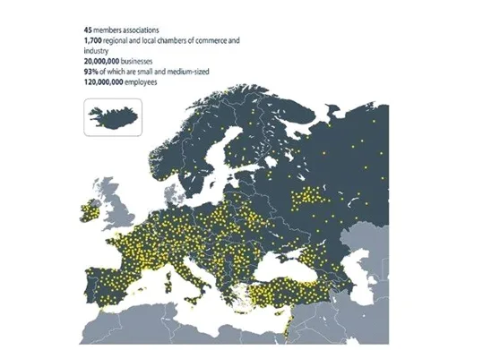 Απεικονίζονται 1700 τοπικά επιμελητήρια για εργαζόμενους σε 20 εκατομμύρια επιχειρήσεις για 120 εκατομμύρια εργαζομένους. Οι κουκίδες των επιμελητηρίων είναι σημαντικής πυκνότητας ακόμη και στην Τουρκία που δεν είναι μέλος της ΕΕ , σε αντίθεση με τη χώρα μας που είναι …ελάχιστες, ως …αμελητέες.