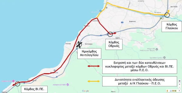 Η Ολυμπία Οδός ενημερώνει τους οδηγούς ότι, στο πλαίσιο των εργασιών για την ολοκλήρωση του υπολειπόμενου τμήματος Μιντιλόγλι – Αλισσός του νέου αυτοκινητόδρομου Πατρών- Πύργου, από τη Δευτέρα 15/9/2025 ώρα 14:00 έως την Κυριακή 30/11/2025 θα τεθεί σε εφαρμογή προσωρινή εκτροπή της κυκλοφορίας και των δύο κατευθύνσεων μεταξύ του Ανισόπεδου Κόμβου (Α/Κ) Οβρυάς και του Α/Κ ΒΙ.ΠΕ προς την Π.Ε.Ο. Πατρών-Πύργου.