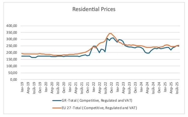 Σύγκριση λιανικών οικιακών τιμών Ελλάδας με τον Μέσο Όρο της Ευρωπαϊκής Ένωσης (2019-2025)