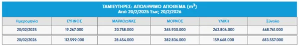 Απ: Τα αποθέματα της Παρασκευής 20 Φεβρουαρίου στους τέσσερις κύριους ταμιευτήρες της Αττικής (Μόρνος, Εύηνος, Υλίκη, Μαραθώνας) ανέρχονται σε περίπου 683,5 εκατ. κυβικά μέτρα. Η εικόνα είναι ελαφρώς βελτιωμένη σε σχέση με την αντίστοιχη περσινή περίοδο και αυτό οφείλεται στην πορεία των φετινών βροχοπτώσεων. Οι ιδιαίτερα αυξημένες βροχοπτώσεις στη Δυτική Στερεά Ελλάδα, ήδη από το φθινόπωρο, έδωσαν μια σημαντική «ανάσα», συμβάλλοντας στον ταχύτερο ρυθμό αναπλήρωσης των αποθεμάτων. Ενδεικτικά, στις περιοχές που τροφοδοτούν τους ταμιευτήρες Μόρνου-Ευήνου, τον Ιανουάριο σημειώθηκαν κατά τόπους ύψη βροχής υπερτριπλάσια του Ιανουαρίου 2025, ενώ για τον Φεβρουάριο οι καταγραφές δείχνουν ήδη ύψη ακόμα και πενταπλάσια από τα περσινά. Αυτό σημαίνει ότι για το επερχόμενο καλοκαίρι δεν αναμένεται άμεσος κίνδυνος για την υδατική μας επάρκεια.